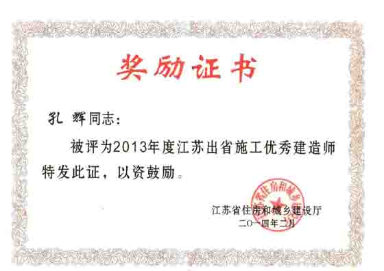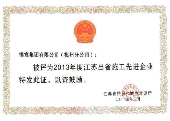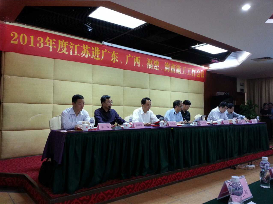 4月25日, 省住建厅在珠海召开“2013年度江苏进广东、广西、福建、海南施工工作会议”,对2013年度江苏进广东、广西、福建、海南施工先进企业及个人予以表扬通报。集团公司被评为“江苏进广东、广西、福建、海南施工先进企业”,广东分公司孔辉同志被评为“优秀建造师”。